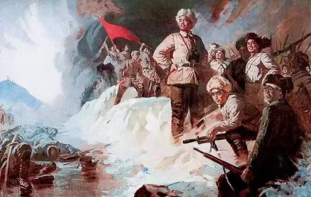 大雪飞扬,寒彻骨、朔风怒吼。东北陷、黍离凄怆,苦战敌后。跃马横刀擎义旆,西征北上彰身手。兴安地、踏破万重山,人昂赳。