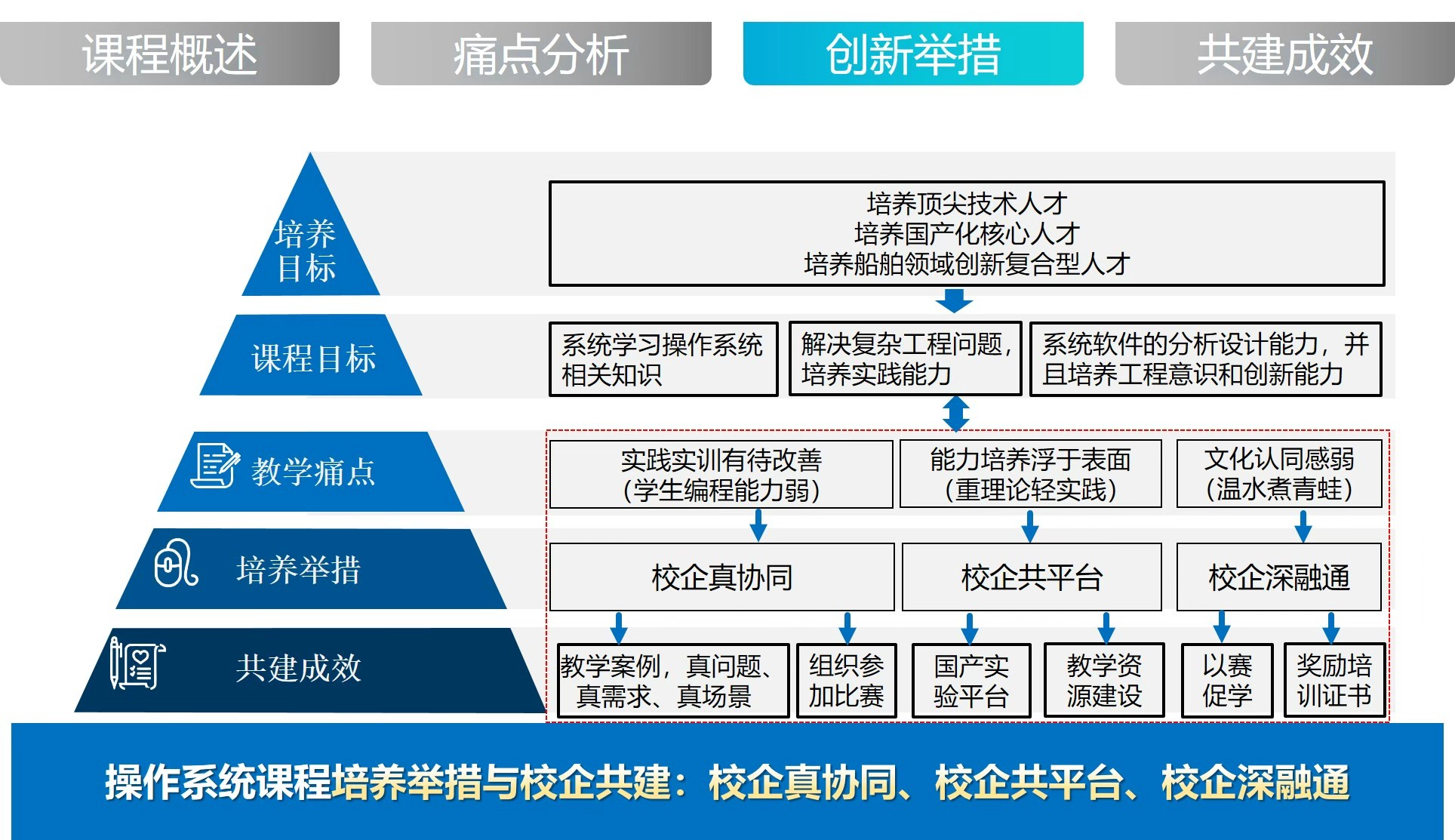 针对学生缺乏国产化意识、对现有技术依赖性较强的问题,为培养学生自主创新能力和文化自信,校企合作采用双师型队伍共同推进教学工作。双方协作完成课程的教学设计、实践指导、大纲制定、创新培养及考核评价等内容。以操作系统理论知识为载体,在各章内容的教学过程中,灵活适宜地穿插介绍操作系统相关产品对应的我国民族企业与国产品牌情况,与华为“智能基座”项目,即引入华为openEuler操作系统实验,进而激发学生的爱国热情与自强不息的精神,从爱国主义情怀、法治意识、榜样力量、合作精神等方面凝练操作系统课程的思政元素。同时,积极参加操作系统课程相关会议,提升教学水平,通过学习和交流结识了国内计算机系统类课程的教师,同时也包括操作系统课程教师。(哈尔滨工程大学计算机学院 王红滨副教授)