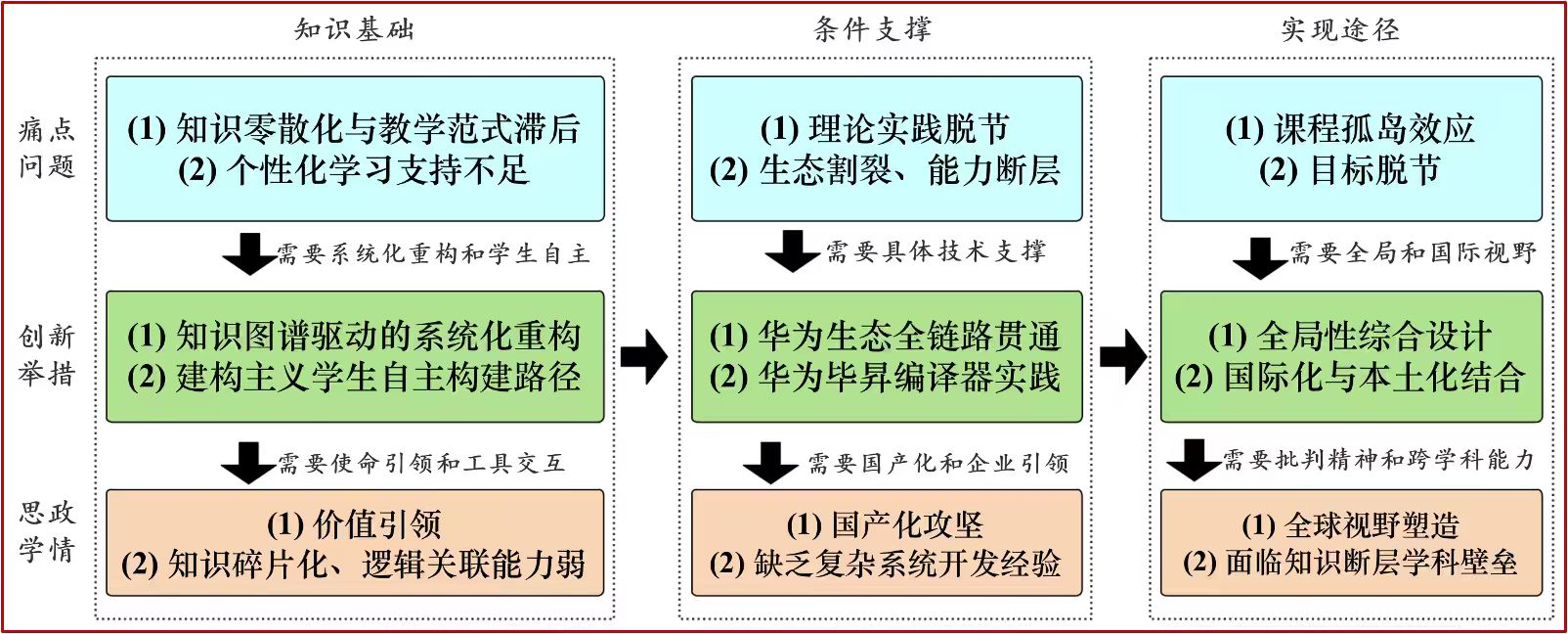 作为新工科建设中的重要课程,其综合性极强,课程基于建构主义学习理论,紧密结合国产化需求,针对知识碎片化、实践脱节、学科壁垒等痛点,构建“知识自主建构-生态全链支撑-全局能力贯通”三维教学体系,形成特色鲜明的改革成果。
