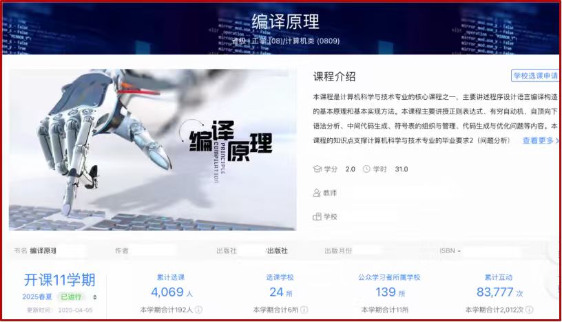 《编译原理》是计算机科学与技术专业的核心基础课程,是理解程序本质与计算机系统运行机理的关键学科纽带,2025年获评国家一流本科课程。作为新工科建设背景下系统能力培养的支柱性课程,其以“程序构造与优化”为核心,是人工智能、大数据、自然语言处理等前沿领域的底层技术支撑。